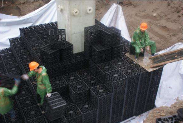 PP模塊構(gòu)筑物采用聚丙烯塑料單元模塊組合,在水池周圍包裹防滲土工布,形成地下貯水池.由于表面光滑,不滋生藻類,可使儲(chǔ)存的水體水質(zhì)保持較長(zhǎng)時(shí)間穩(wěn)定.