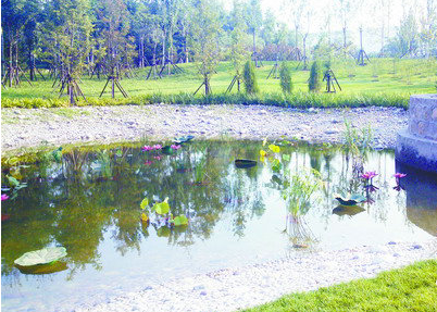小區(qū)沿著排水道建有滲透淺溝,表面植有草皮,供雨水徑流流過時下滲.超過滲透能力的雨水則進(jìn)入雨水池或人工濕地,作為水景或繼續(xù)下滲.